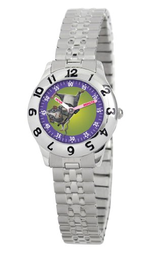 Get a Black Belt in timekeeping with the Disney Kids' G-Force Time Teacher Expansion Strap Watch. This adventurous watch features an image of martial arts expert Agent Juarez from Disney's G-Force. Although the G-Force specializes in espionage, this watch's eye-catching green- and purple-tone dial makes it hard to go undercover. And your child will have no trouble telling the time with this watch, thanks to the large, easy-to-read numerals. Crisp white Arabic second indexes can be found on the outer dial in increments of five, while black Arabic hourly indexes are boldly etched into the silver-tone bezel. For long-lasting use, both the bezel and case are durable metal and connect to a matching metal linking band with an easy-fasten fold-over clasp. Plus, this lively, kid-friendly timepiece is built to survive playtime with reliable quartz movement, fine mineral dial-protection, and water resistance to 99 feet (30 M). This fun-to-wear watch comes with an exclusive stainless steel Disney case for superior presentation and long-term protection.