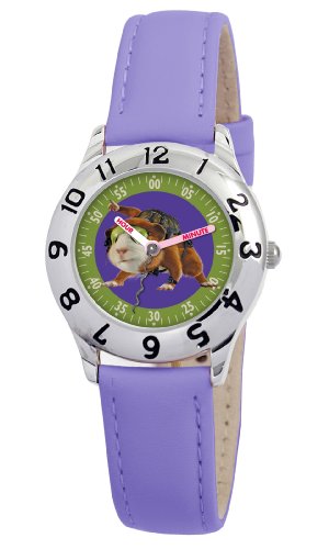 Live on the edge with the Disney Kids' G-Force Time Teacher Purple Leather Strap Watch. This adventurous watch features an image of gutsy Agent Darwin, ringleader and expert video game player of Disney's G-Force. Although the G-Force specializes in espionage, this watch's eye-catching purple- and green-tone dial makes it hard to go undercover. And your child will have no trouble telling the time with this watch, thanks to the large, easy-to-read numerals. Crisp white Arabic second indexes can be found on the outer dial in increments of five, while black Arabic hourly indexes are boldly etched into the silver-tone bezel. For long-lasting use, both the bezel and case are durable metal and connect to a playful, purple-tone leather band with an easy-fasten buckle clasp. Plus, this lively, kid-friendly timepiece is built to survive playtime with reliable quartz movement, fine mineral dial-protection, and water resistance to 99 feet (30 M). This fun-to-wear watch comes with an exclusive stainless steel Disney case for superior presentation and long-term protection.