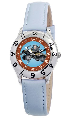 Teach your child how to tell time with Disney's G-Force Watch. With a blue dial featuring an image of Agent Blaster and clearly labeled "HOUR" and "MINUTE" hands, this watch is designed to familiarize children with analog timekeeping. The metal bezel features oversized, easy-to-read black Arabic numerals, while the durable mineral crystal and blue leather watchband provide extra durability. A must-have for fans of Disney, this fun-to-wear watch features quartz movement and is water resistant to 99 feet (30 meters).