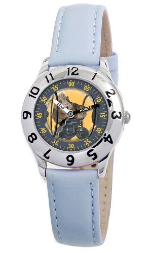 Teach your child how to tell time with Disney's G-Force Watch. With a yellow dial featuring clearly labeled "HOUR" and "MINUTE" hands and an image of Agent Darwin and Agent Hurley, this watch is designed to familiarize children with analog timekeeping. The metal bezel features oversized, easy-to-read black Arabic numerals, while the durable mineral crystal and blue leather watchband provide extra durability. A must-have for fans of Disney, this fun-to-wear watch features quartz movement and is water resistant to 99 feet (30 meters).