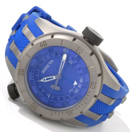 The relaxed and sleek style of the Invicta Men's Force Collection Titanium and Blue Rubber Watch is great for casual or business attire. The round case is created from grey titanium and topped with a matching unidirectional bezel. The blue dial displays luminous grey hands, an outside dial ring with Arabic numerals at each five-minute interval, and a 24-hour scale inner dial ring. This unique dial also features an easy-read date window at the three o'clock position. Other features of this watch include a GMT function and a screw-down crown. The blue polyurethane strap securely fastens with a buckle clasp and shows off grey titanium accents. This timepiece offers reliable Swiss quartz movement and is protected by a durable flame-fusion crystal. The watch is water-resistant to a depth of 330 feet (100 meters).