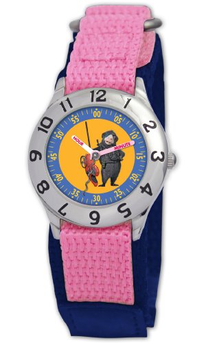 Get armed for timekeeping with the Disney Kids' G-Force Time Teacher Pink Velcro Watch. This adventurous watch features an image of fast-paced weapons expert Agent Blaster from Disney's G-Force. Although the G-Force specializes in espionage, this watch's eye-catching yellow- and blue-tone dial makes it hard to go undercover. And your child will have no trouble telling the time with this watch, thanks to the large, easy-to-read numerals. Clear yellow-tone Arabic second indexes can be found on the outer dial in increments of five, while black Arabic hourly indexes are boldly etched into the silver-tone bezel. For long-lasting use, both the bezel and case are durable metal and connect to a cheerful pink and blue nylon Velcro band that fastens with ease. Plus, this lively, kid-friendly timepiece is built to survive playtime with reliable quartz movement, fine mineral dial-protection, and water resistance to 99 feet (30 M). This fun-to-wear watch comes with an exclusive stainless steel Disney case for superior presentation and long-term protection.