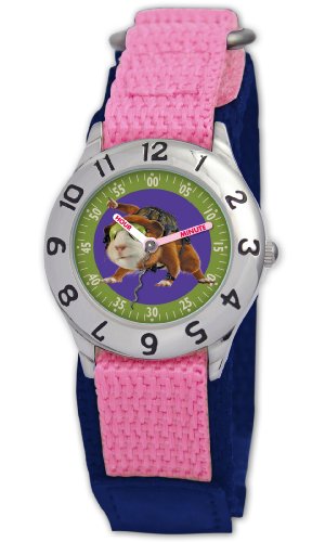 Live on the edge with the Disney Kids' G-Force Time Teacher Pink Velcro Watch. This adventurous watch features an image of gutsy Agent Darwin, ringleader and expert video game player of Disney's G-Force. Although the G-Force specializes in espionage, this watch's eye-catching purple- and green-tone dial makes it hard to go undercover. And your child will have no trouble telling the time with this watch, thanks to the large, easy-to-read numerals. Crisp white Arabic second indexes can be found on the outer dial in increments of five, while black Arabic hourly indexes are boldly etched into the silver-tone bezel. For long-lasting use, both the bezel and case are durable metal and cheerful pink and blue nylon Velcro band that fastens with ease. Plus, this lively, kid-friendly timepiece is built to survive playtime with reliable quartz movement, fine mineral dial-protection, and water resistance to 99 feet (30 M). This fun-to-wear watch comes with an exclusive stainless steel Disney case for superior presentation and long-term protection.